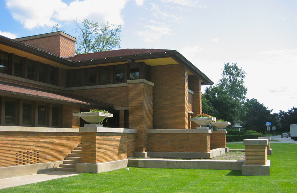 Otra característica a resaltar es la curiosa composición de los muros de fachada. En este caso, Wright no sólo se conforma con marcar la horizontal con ladrillos romanos de proporciones alargadas, voluminosos alfeizares y la prolongación del peto del jardín, sino que además recurre a la policromía con la alternancia de hileras que sobresalen para acentuar esa horizontal. Esto muestra en Wright un nuevo interés por la plasticidad de los cerramientos, que se refleja también de alguna forma en las pequeñas aberturas realizadas en el peto de entrada. Este tímido gesto, aparentemente anecdótico, cobrará especial protagonismo en muchos de los proyectos futuros de Wright.