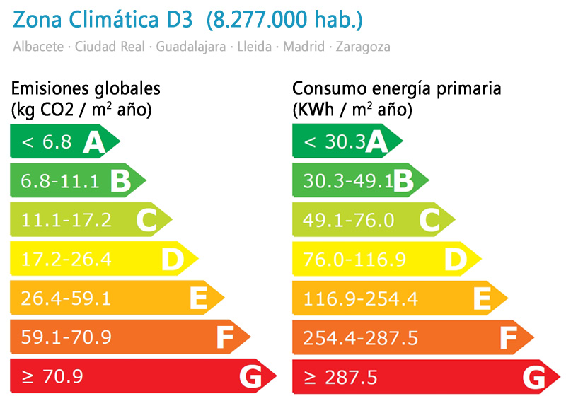 Cada zona climática se define combinando la severidad del invierno de la A a la E, y la severidad del verano del 1 al 4. Estos límites exigidos tanto de emisiones como de consumo de energía primaria se endurecen conforme se reduce la severidad climática de invierno, que es la que más exigirá calefacción. La severidad del verano también puede ser relevante ya que no olvidemos que las instalaciones de refrigeración más utilizadas en España consumen electricidad, con su respectiva penalización.