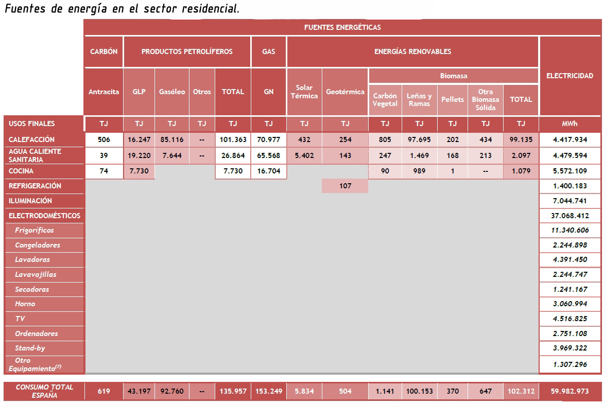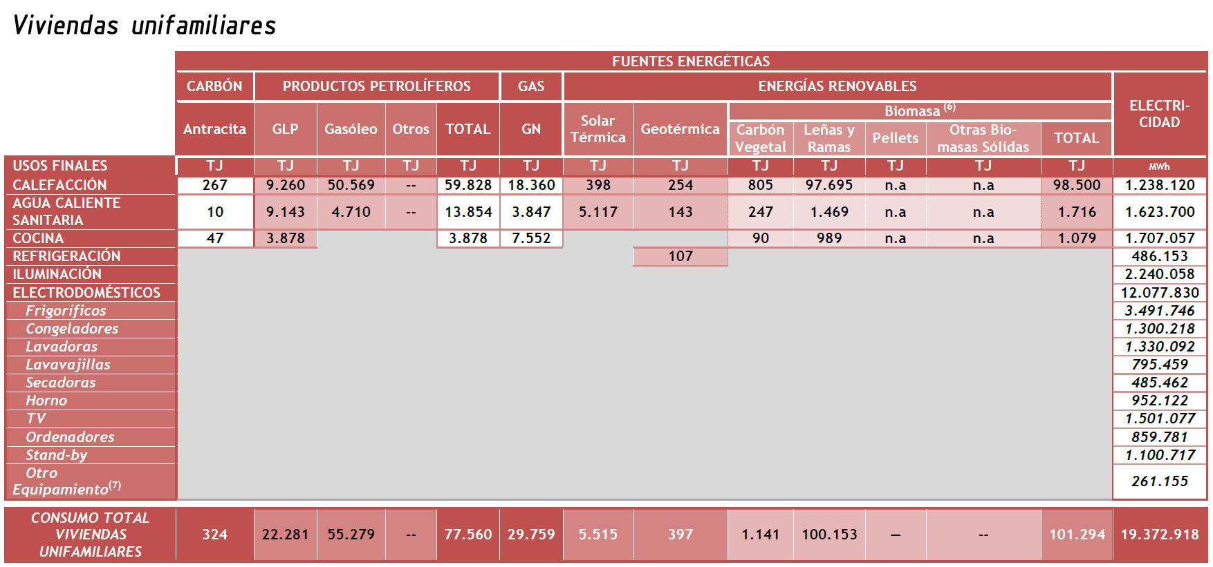 - El consumo medio de las viviendas unifamiliares casi duplica el valor nacional, con 55,2 TJ al año (1,318 tep/hogar).