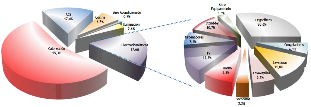 - El mayor consumo en una vivienda se destina a la producción de calor, repartido en calefacción y agua caliente sanitaria.