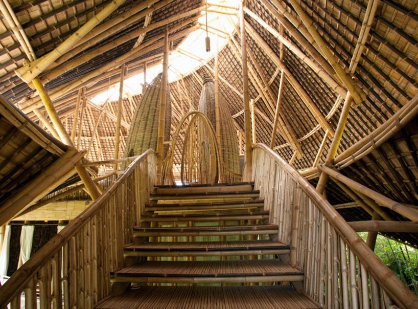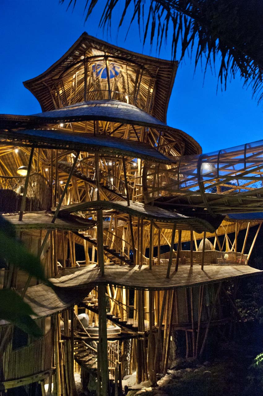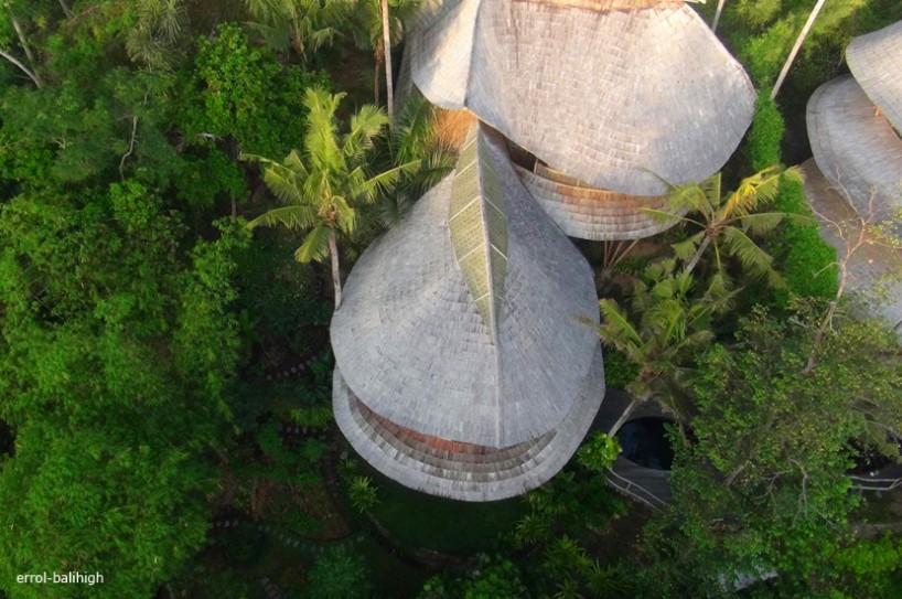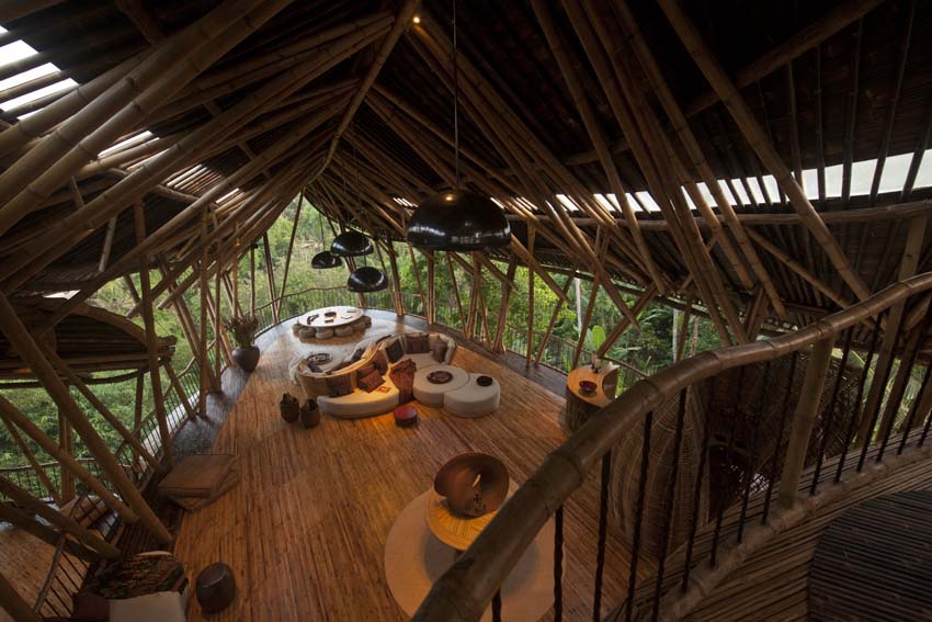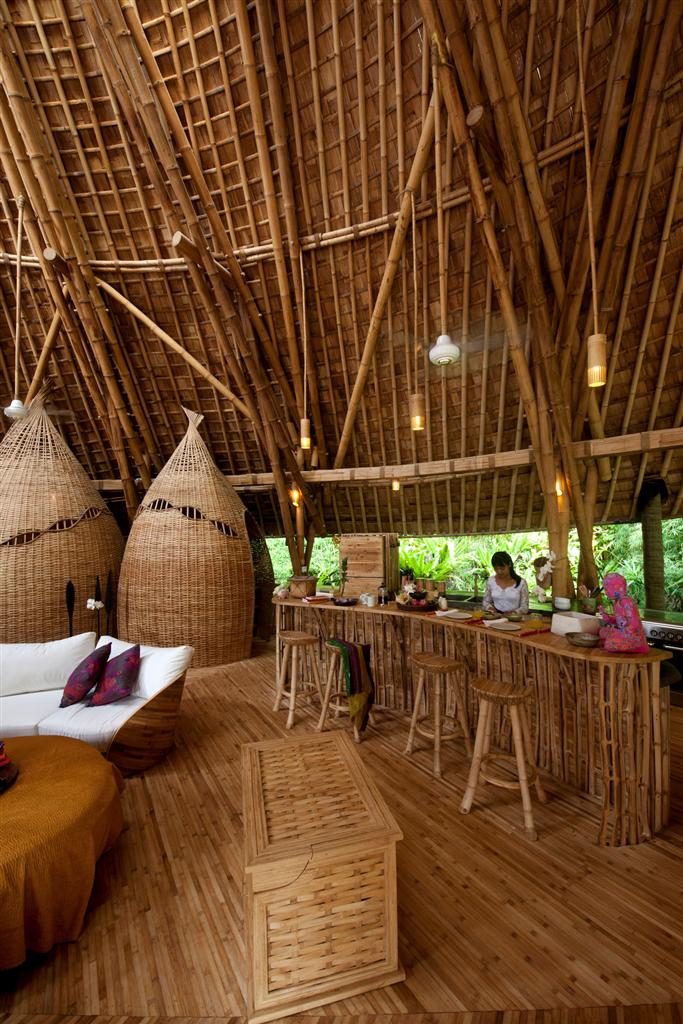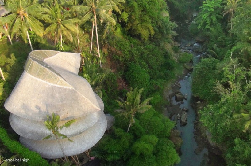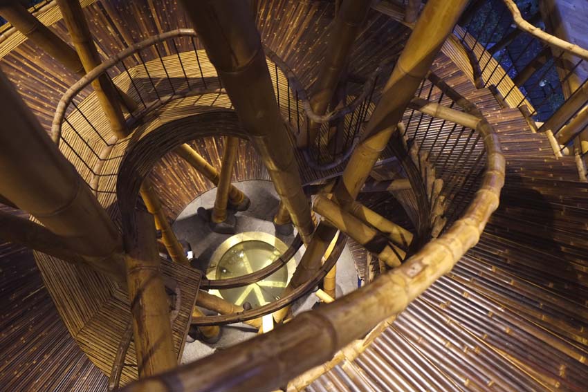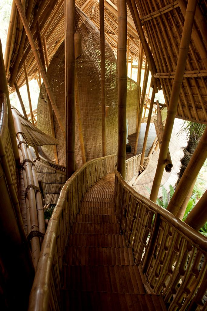 Construcción: La estructura de bambú más alta construida en Bali, consta de 6 niveles soportados por un doble núcleo central de pilares de bambú. Dispone de un túnel de acceso de 15m de largo.