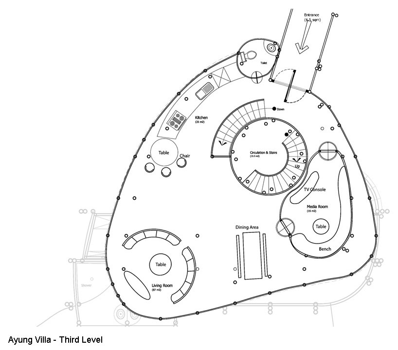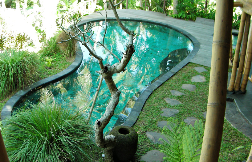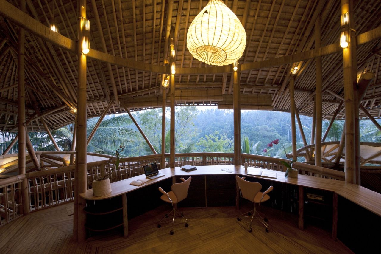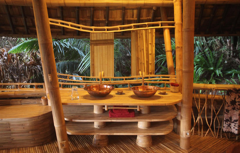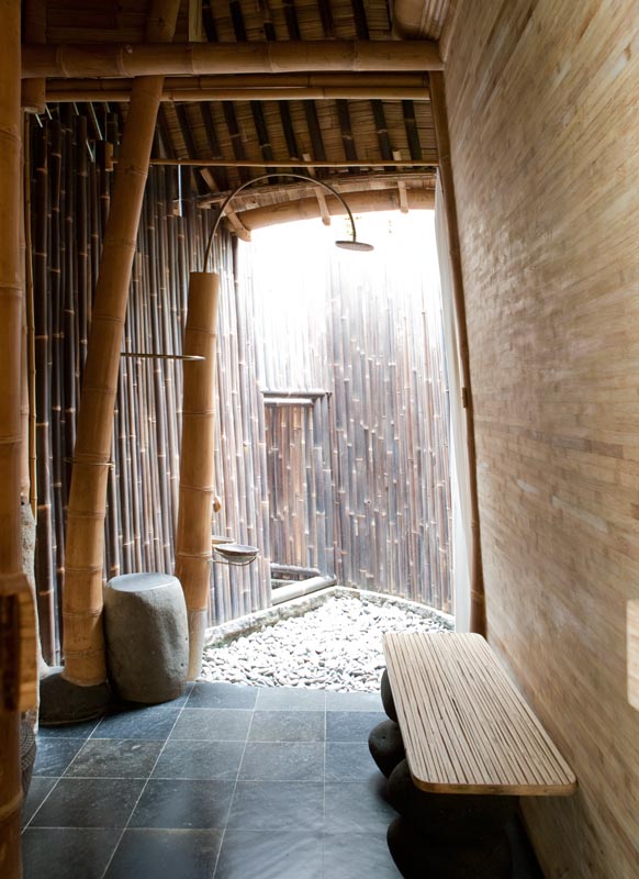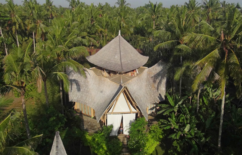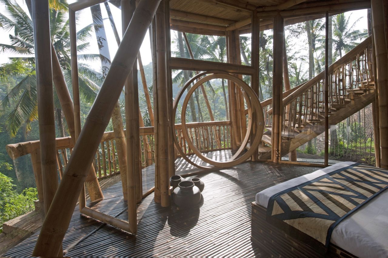 Construcción: La estructura de bambú más alta construida en Bali, consta de 6 niveles soportados por un doble núcleo central de pilares de bambú. Dispone de un túnel de acceso de 15m de largo.