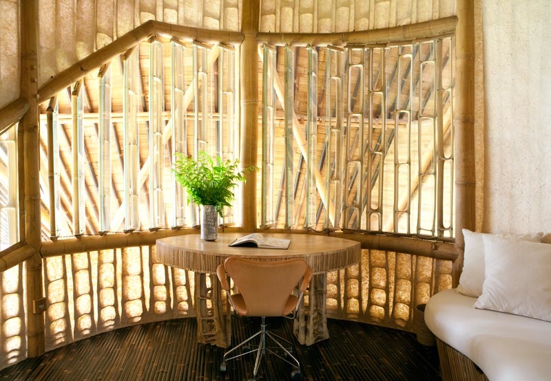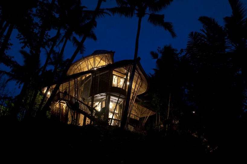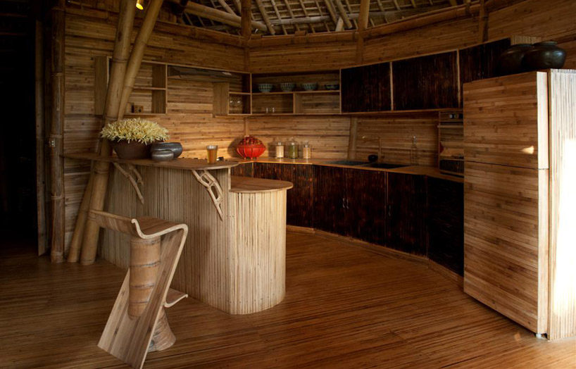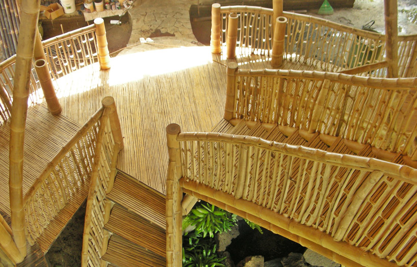Construcción: Estructura realizada con 8.000 m de bambú. Un núcleo central de múltiples pilares de bambú atraviesa y sujeta las 4 plantas de la vivienda.