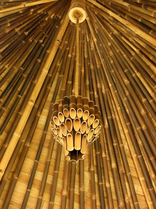 Aunque el bambú se utilice como material estructural primario, otros materiales son necesarios como el hormigón armado junto a piedras para reforzar los cimientos y alejar el bambú de la humedad del terreno. En la cubierta, las tejas de bambú son protegidas con un esmalte de aluminio, una solución que personalmente me intriga, no por su efectividad, que lo es, sino porque el proceso de fabricación del aluminio es altamente contaminante, y nos encontramos en un poblado ecologista… Si alguien tiene algún dato al respecto, le agradeceré su opinión.