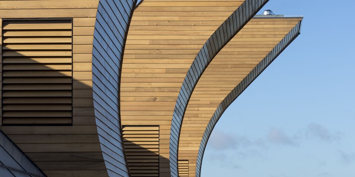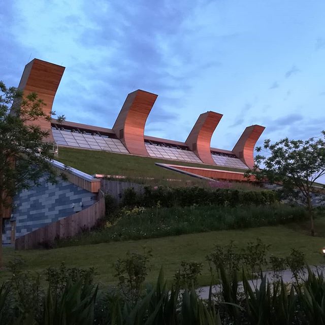Distribuido en dos plantas, su fachada norte arranca del suelo con una cubierta verde, abriéndose a la luz del sur con amplios ventanales. Cuatro grandes chimeneas a 45 grados ventilan el edificio de forma natural, prescindiendo de ese modo de los sistemas tradicionales de extracción. Integrando además tecnologías renovables como paneles fotovoltaicos y biocombustibles para la calefacción, este edificio logra mantenerse neutro en cuanto a emisiones de CO2. De hecho, tanto los materiales utilizados como el proceso de construcción han colaborado para tal fin, a pesar de ciertos infortunios que ya os contaré…