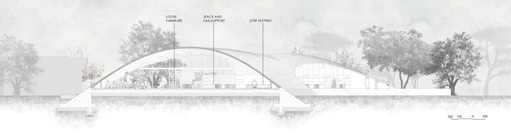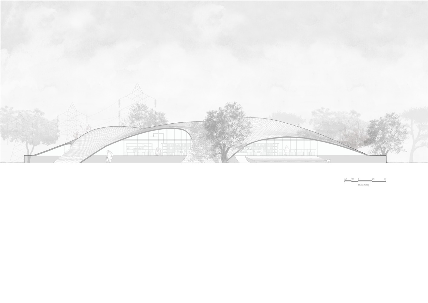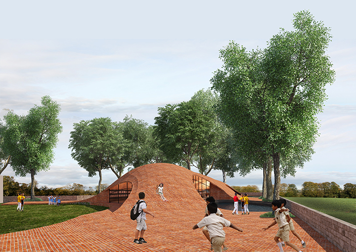 De material terroso y forma ondulada, esta bóveda bien parece un desdoblamiento del terreno. Por su gran resistencia, puede incluso ser transitada a pie, u ofrecerse como montículo de escalada para los escolares, ¡una propuesta que no me imagino defender en España ante el Código Técnico sin rodearla de barandillas no escalables!
