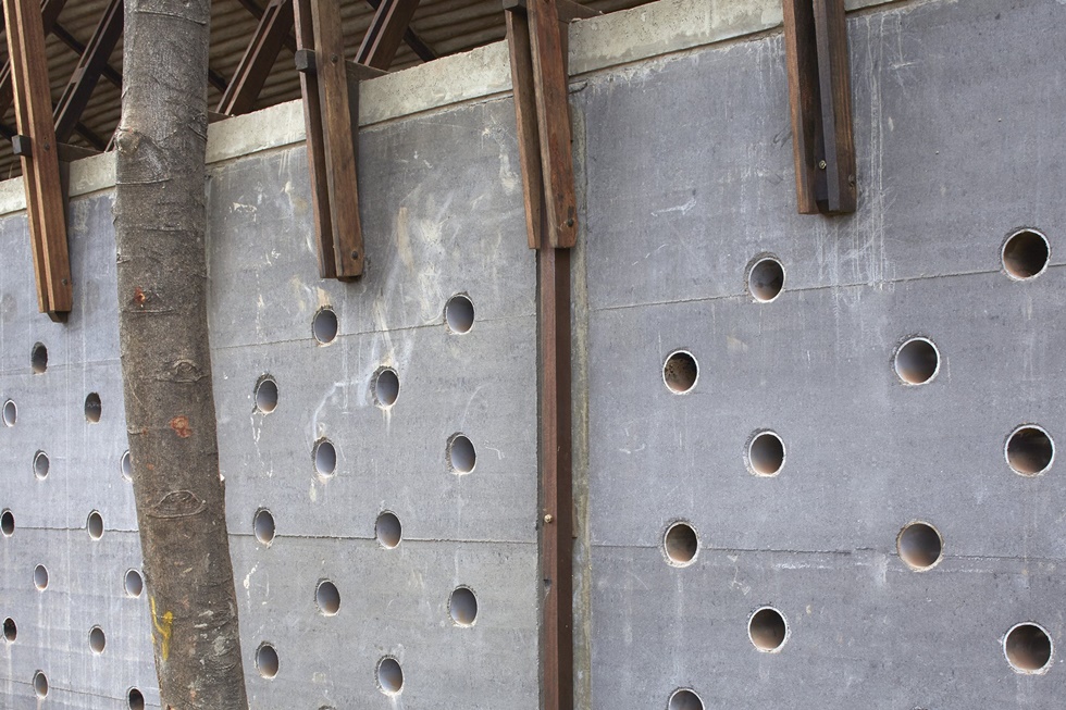 Los muros participan de esta permeabilidad al aire. Los de basalto por un lado aportan un ritmo regular de perforaciones circulares; mientras que los de ladrillo aprovechan su profundo llagueado, que puntualmente desaparece, transformando el muro en una celosía cerámica.