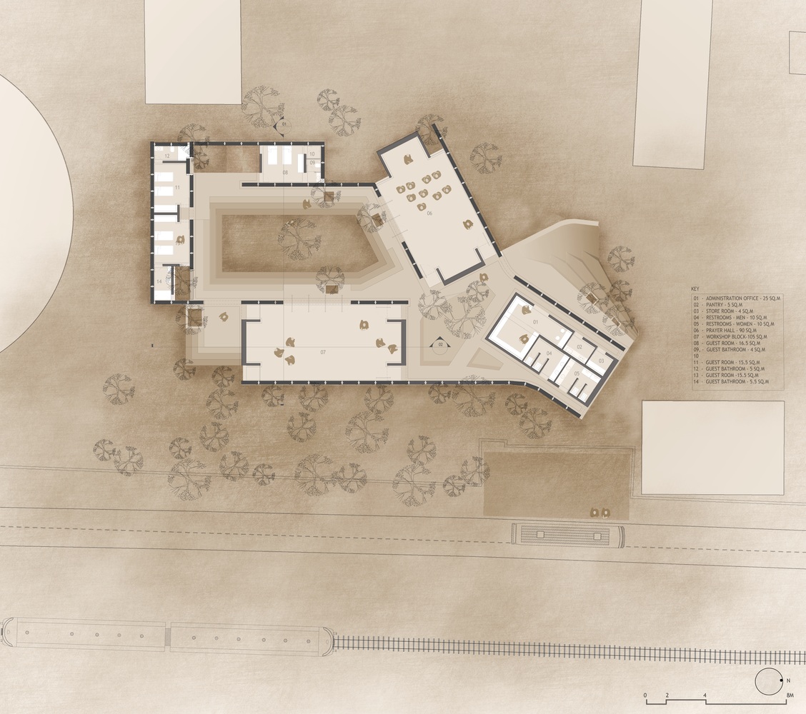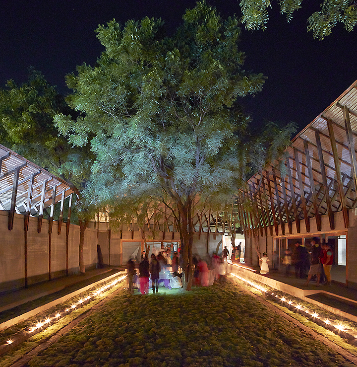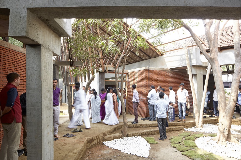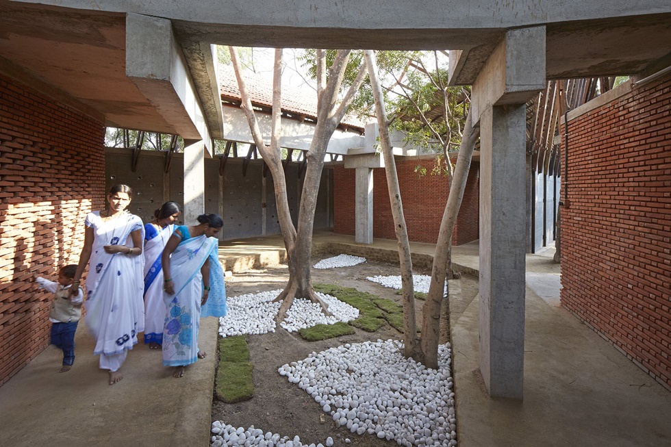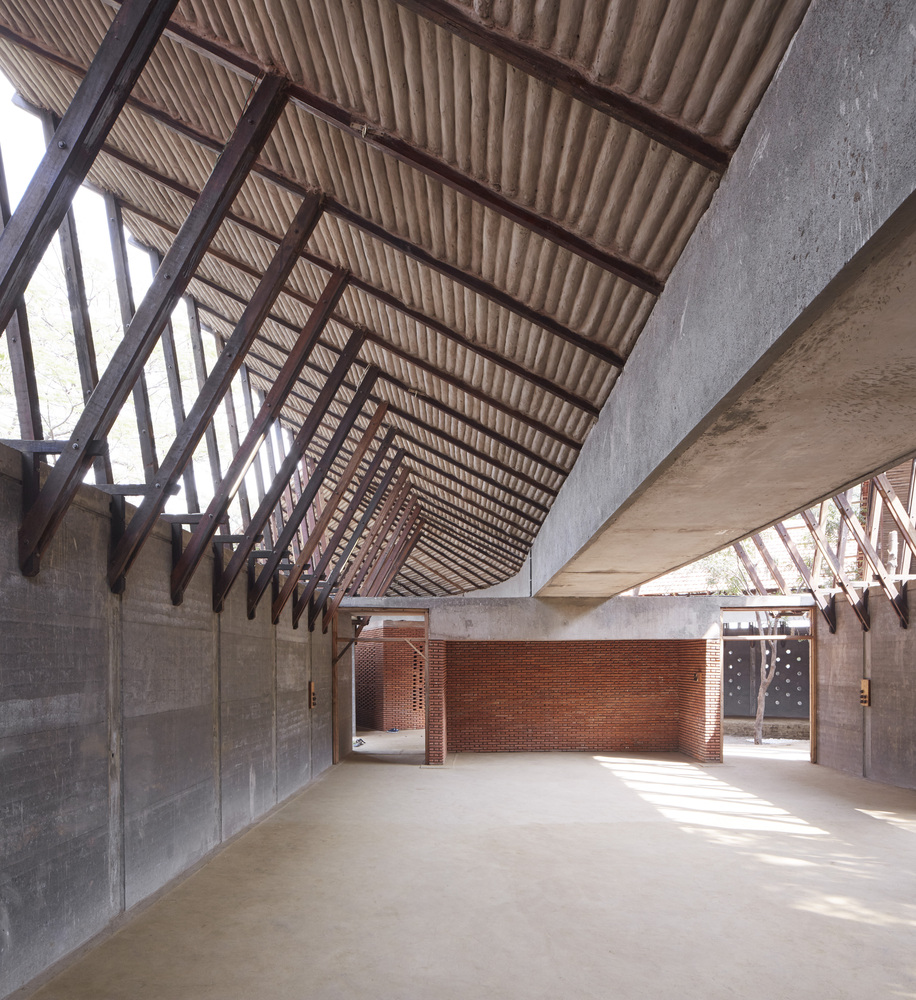 Con la premisa de que ningún árbol resultara dañado, el estudio de arquitectura Sameep Padora traza varias galerías formando dos patios que rodean la vegetación existente. El programa consta de una zona administrativa y de estancias para huéspedes, pero el alma del centro se encuentra en sus dos amplias salas diáfanas, lugar de prácticas de meditación y yoga.