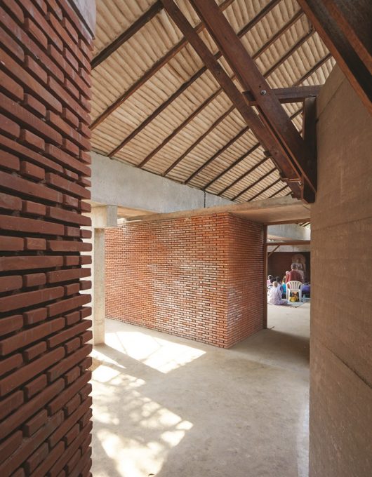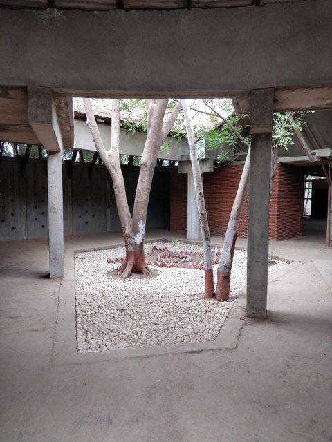 La ventilación cruzada que proporciona este diseño favorece una sensación de frescor al interior, lo que es de agradecer en una región cuyas temperaturas alcanzan los 40º. Si aparcamos un momento la lógica funcional occidental, veremos que en realidad no deja de ser un espacio exterior acotado y protegido del sol, que prioriza el contacto con la naturaleza para los procesos meditativos. Quizás la lluvia no resulte entonces tan importante.