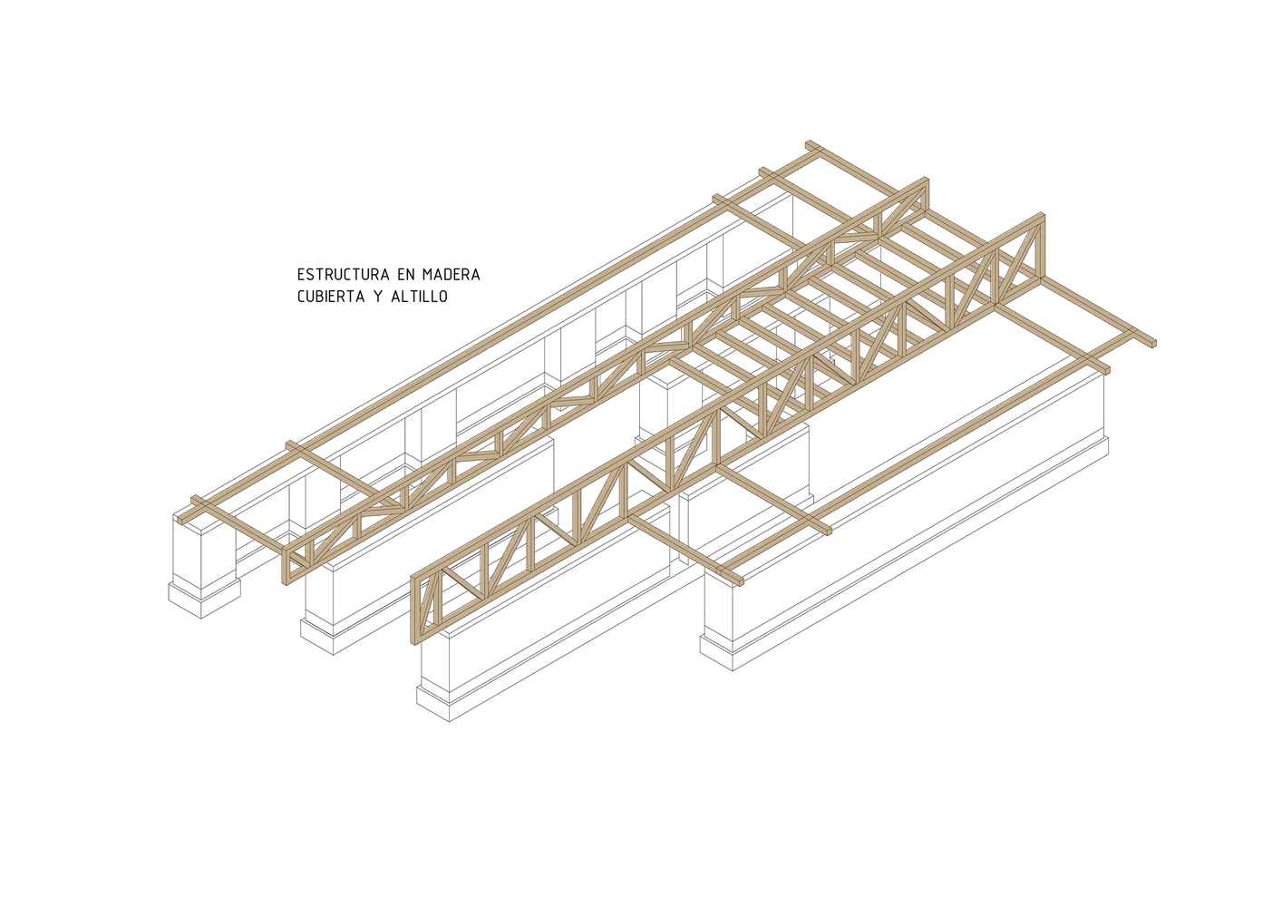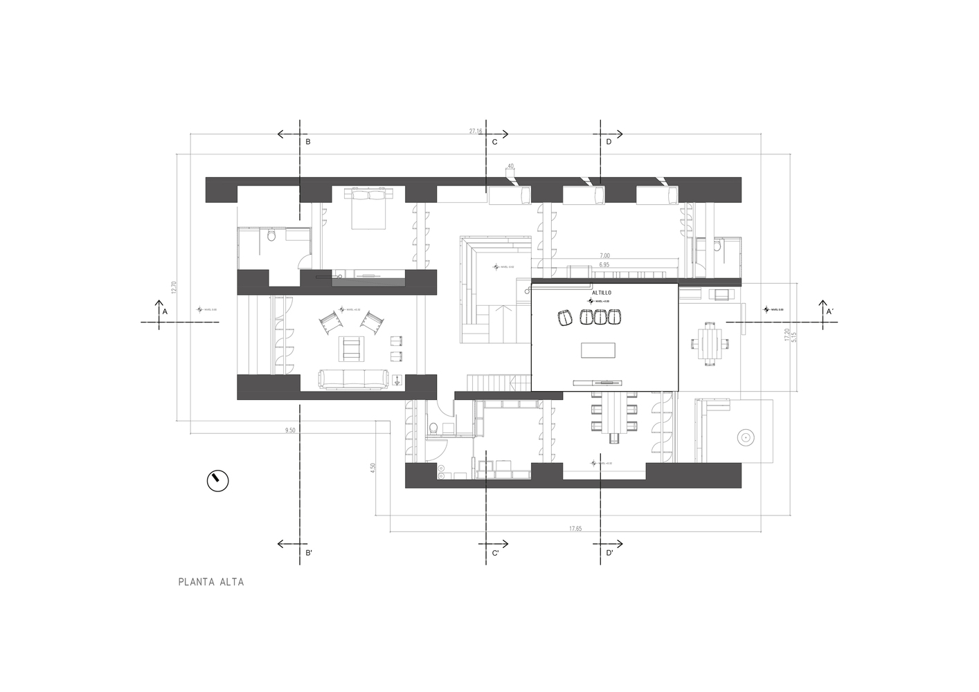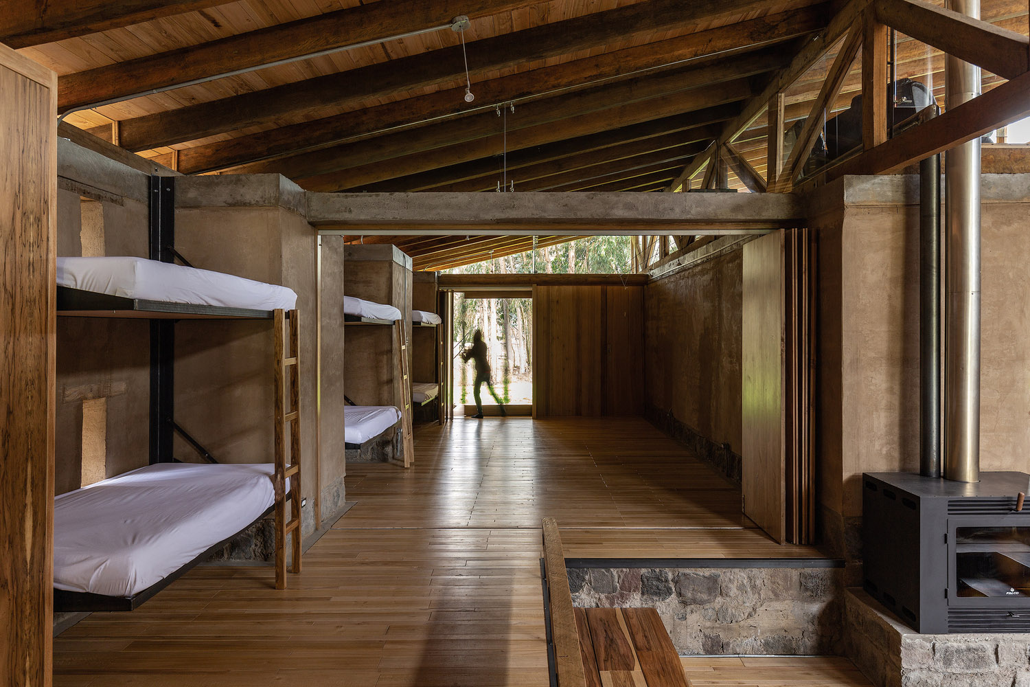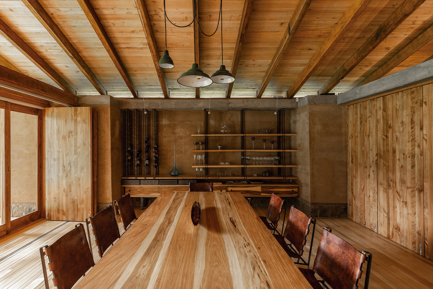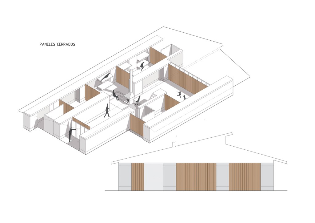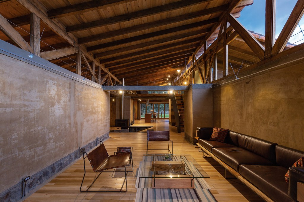 Las tres “naves” quedan articuladas por el corazón de la casa: el hogar de reunión, rehundido junto a la chimenea, y un altillo que domina las vistas entre las dos cerchas de madera. El perfil quebrado de la cubierta permite la entrada de mucha luz natural. De hecho, el vidrio a hueso entre el entramado de madera es todo un acierto. El contraste es fuerte. En un espacio de protección hermética entre muros ciegos, la vista logra escapar al cielo a través de una cubierta que parece flotar.