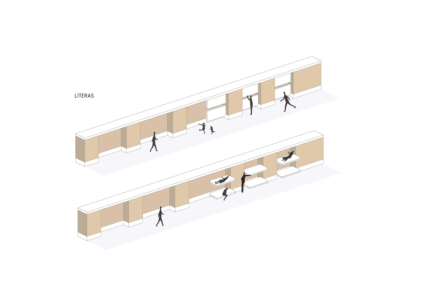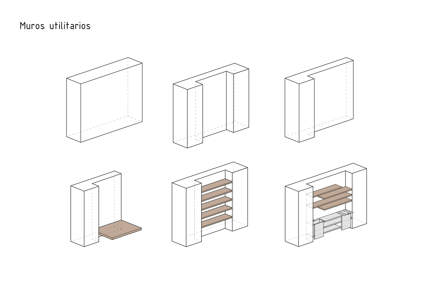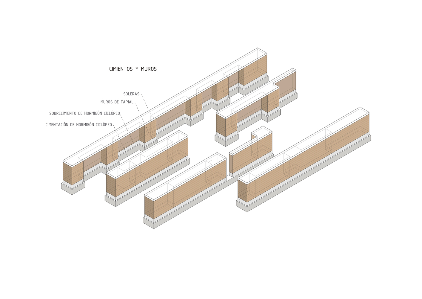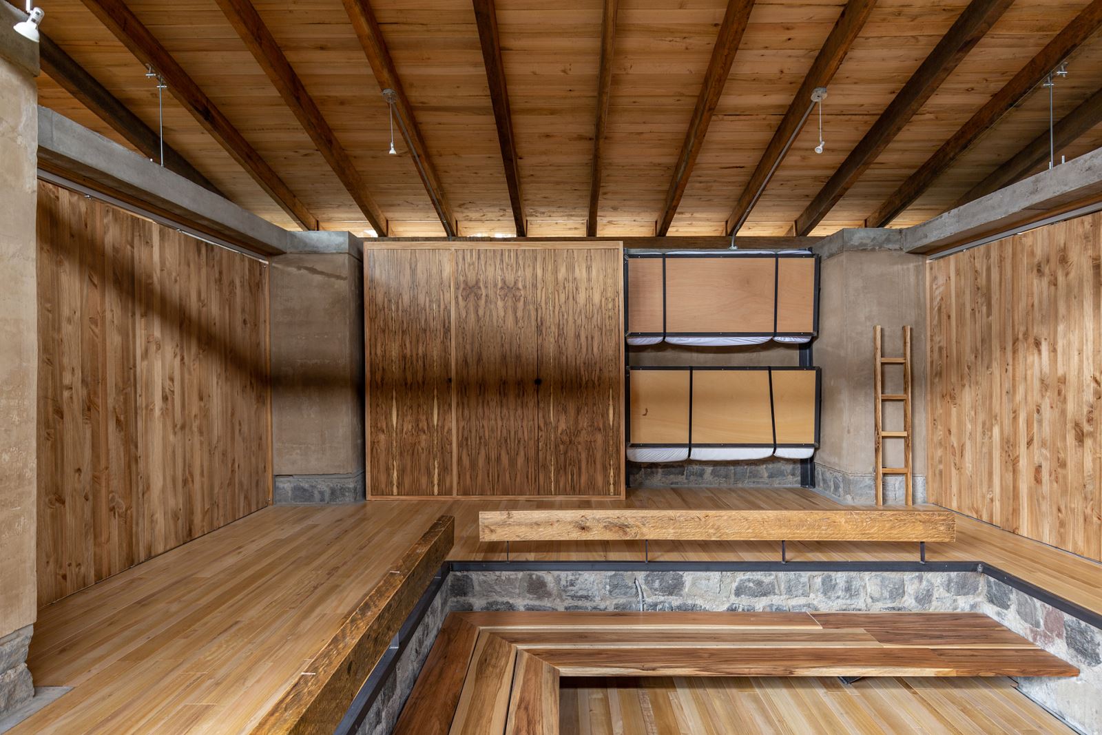 Cinco muros portantes de tapial se levantan paralelos como protección a los vientos dominantes. Con un grosor de 40cm, su elevada inercia térmica aumenta considerablemente la sensación de confort. Casi todo el mobiliario queda alojado entre sus contrafuertes de 80cm; cocina, estanterías, armarios… e incluso las camas de los hijos e invitados. Tan solo el dormitorio principal define su espacio como tal. Si necesitas compartimentar, unos paneles pivotantes de madera te lo permiten. Sino, el resto del tiempo podrás disfrutar de un espacio libre y diáfano.