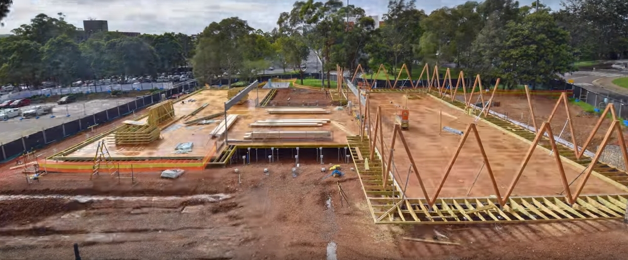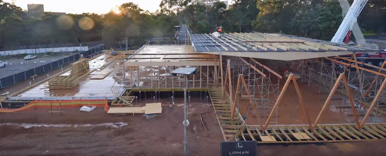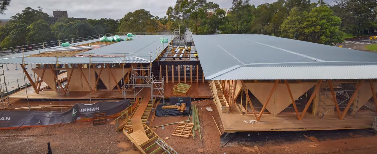 En este timelapse de tres minutos quedan comprimidos un total de cinco meses de obra de este pabellón de 953m2. Como ya adelanté en su artículo de introducción, la elección de un sistema constructivo prefabricado de madera responde a sus posibilidades de desmontaje y reutilización, además de una mayor rapidez en la fase de ejecución. Prácticamente la totalidad de la obra fue realizada en seco, sin interferir en la actividad del campus.