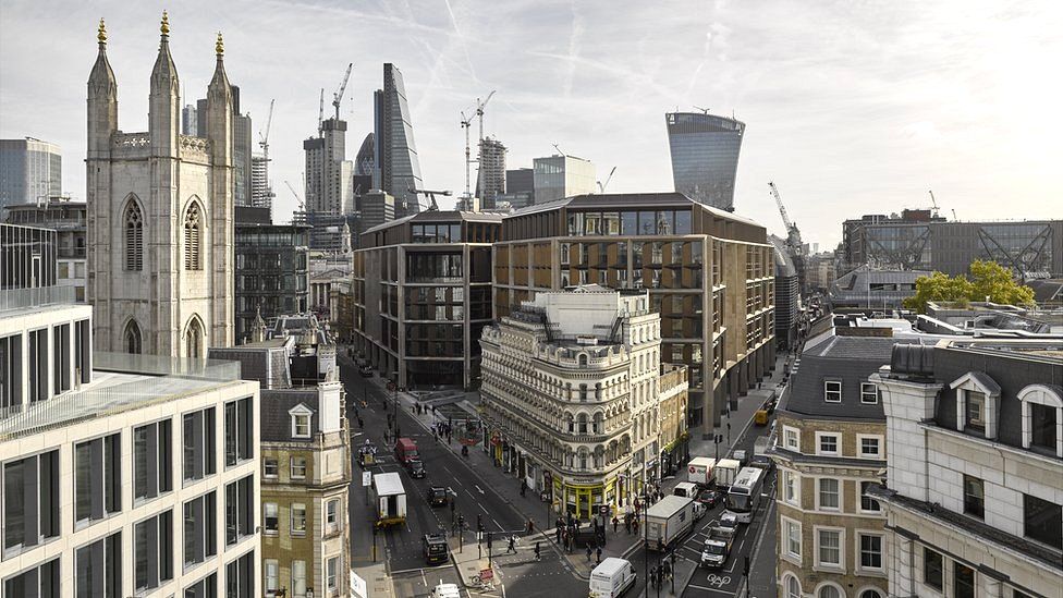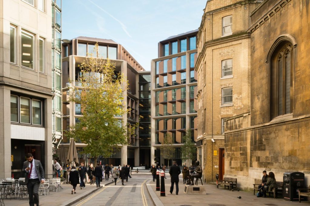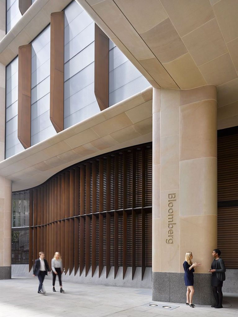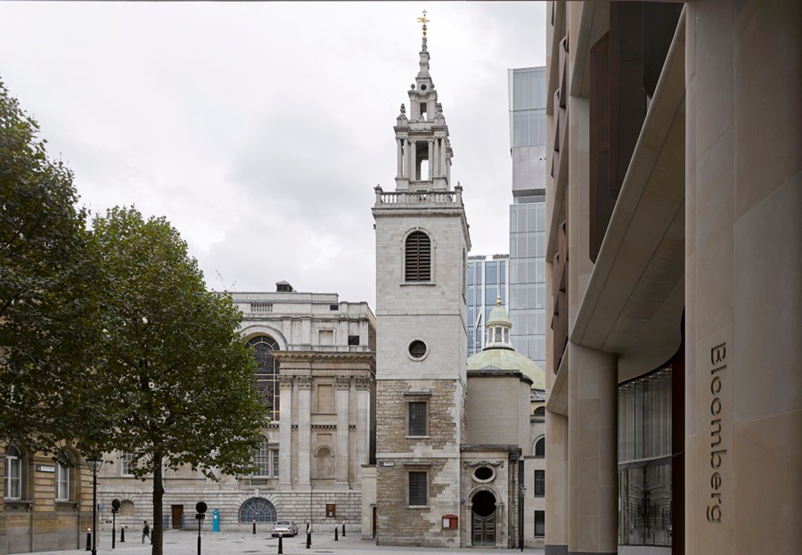 Rodeado de edificios emblemáticos del centro de Londres, como el Banco de Inglaterra, la Catedral de St Paul y la iglesia de St Stephen Walbrook, la nueva sede de Bloomberg se erige con carácter moderno a la vez que solemne y respetuoso.