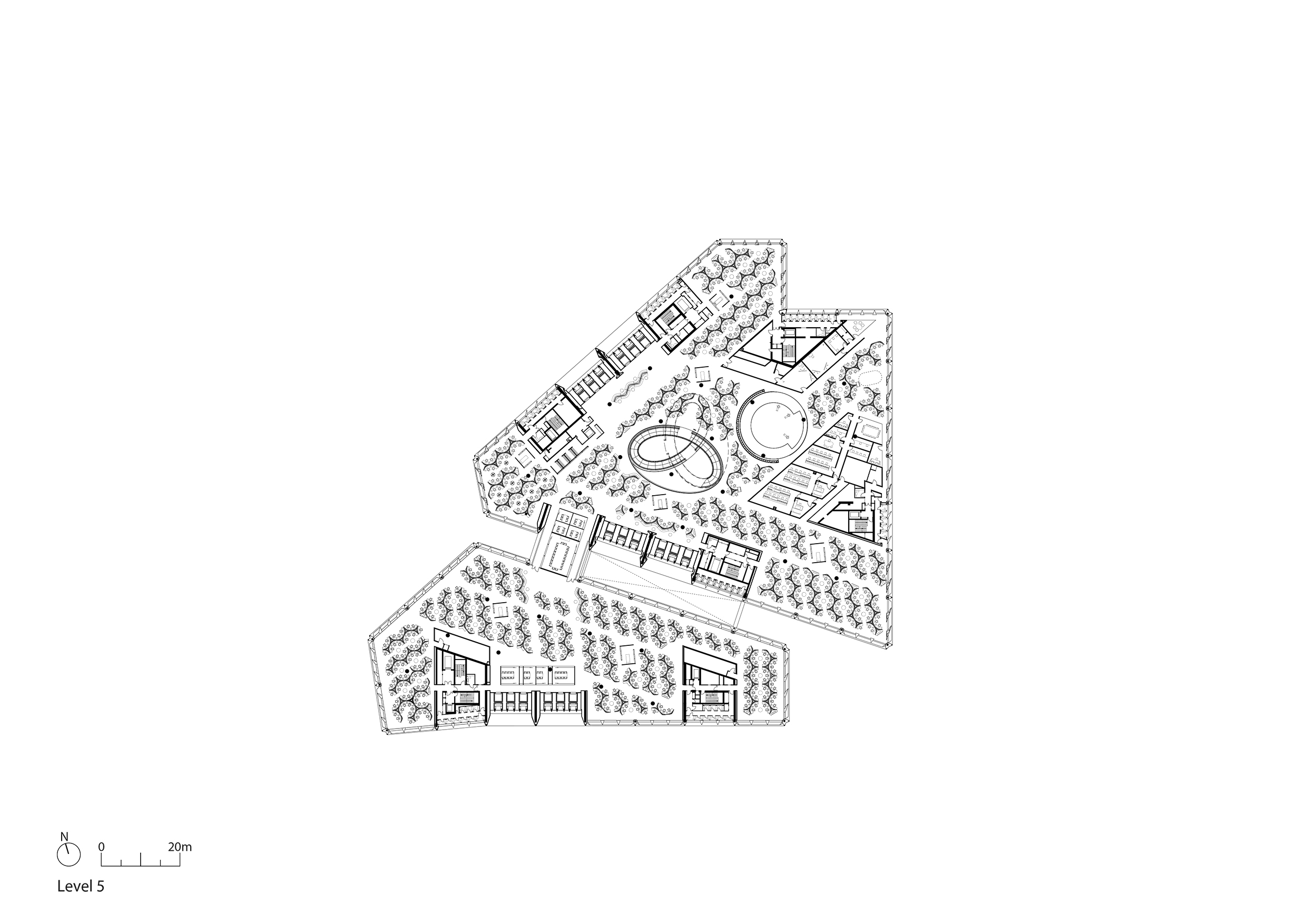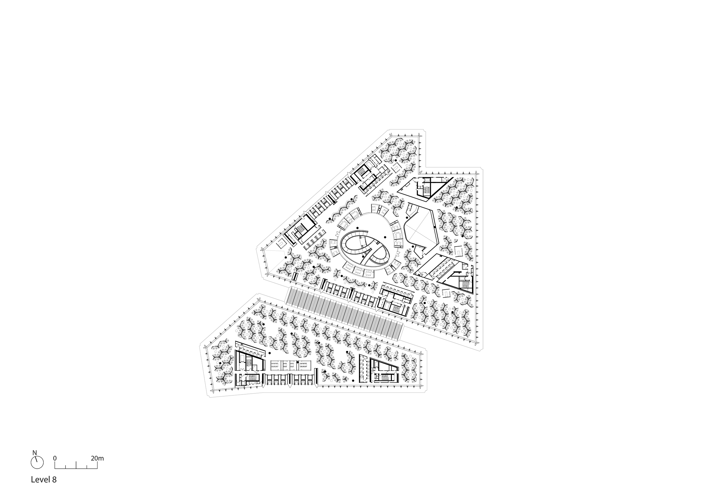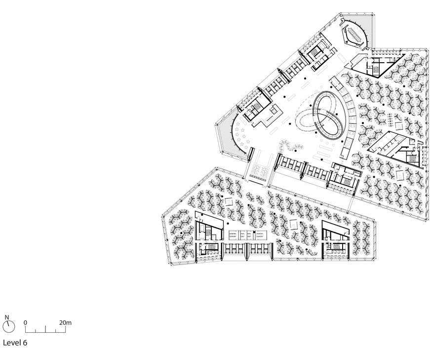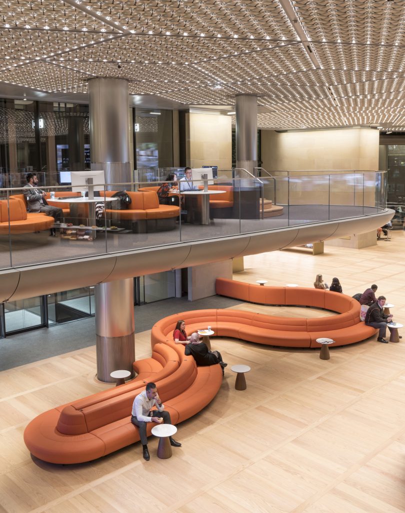 Este diseño fluido enlaza con un impresionante vestíbulo envuelto por tres cáscaras de roble rojo americano. Ahí nos esperan los ascensores para un ascenso directo a la última planta, un espacio en doble altura llamado la “despensa”. Podríamos decir que se trata de una cafetería, pero sin llegar a serlo, ya que únicamente podrás servirte un café y a lo sumo cereales. La intención, evitar el síndrome Google, empujando a sus trabajadores a salir del edificio para hacer vida de ciudad a la hora de la comida. Lo que sí ofrece a sus ocupantes es una invitación al reposo e interacción social, rodeado de jardines verticales, abundante luz natural y unas maravillosas vistas a la catedral de St Paul.