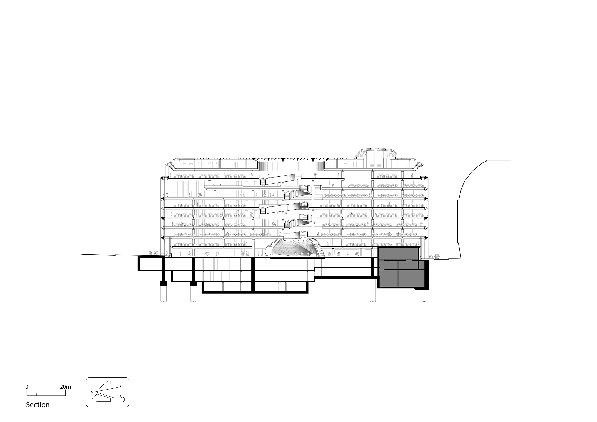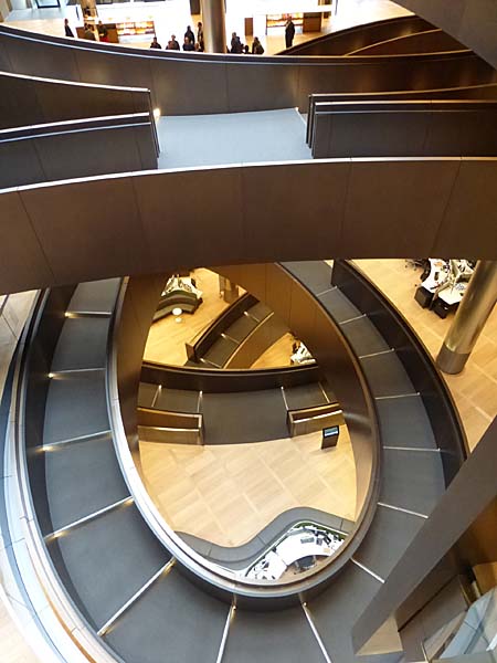 El corazón del edificio es claramente la rampa helicoidal revestida de bronce. Bañada por la luz de la cubierta acristalada, desciende los seis pisos con un suave recorrido en forma de bucle escalonado, una verdadera “promenade” dimensionada para permitir encuentros fortuitos con los compañeros, sin por ello interrumpir el paso.