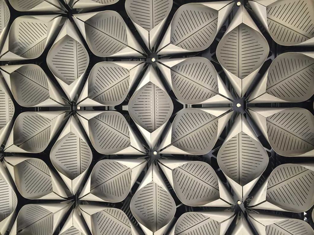 En total suman la friolera de 2,5 millones de pétalos, fabricados con la aleación R75 de aluminio reciclado con el fin de limitar la huella de carbono del edificio. Como gran conductor del calor, el aluminio es un material perfecto para un sistema integrado de refrigeración. En verano, los pétalos son enfriados por un circuito de agua fría. Éstos a su vez enfrían el aire proveniente de la “branquias”, antes de permitir su ascenso por el gran atrio central. Sin duda una alternativa de bajo consumo energético frente al tradicional aire acondicionado, posible gracias al programa CFD (Computational Fluid Dynamics) que optimizó la forma de los pétalos para un mejor flujo de aire.
