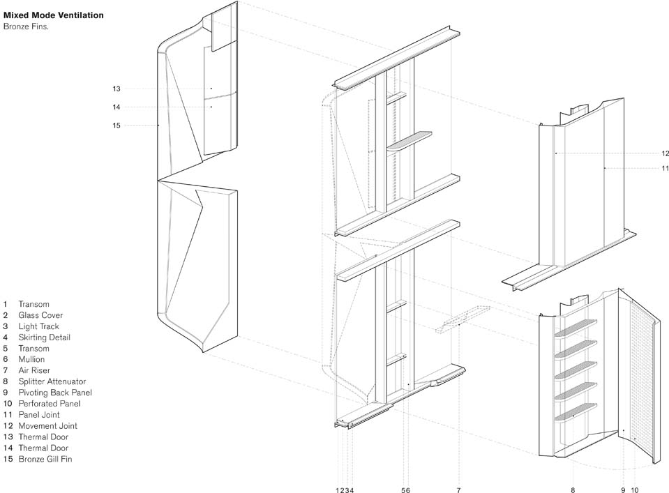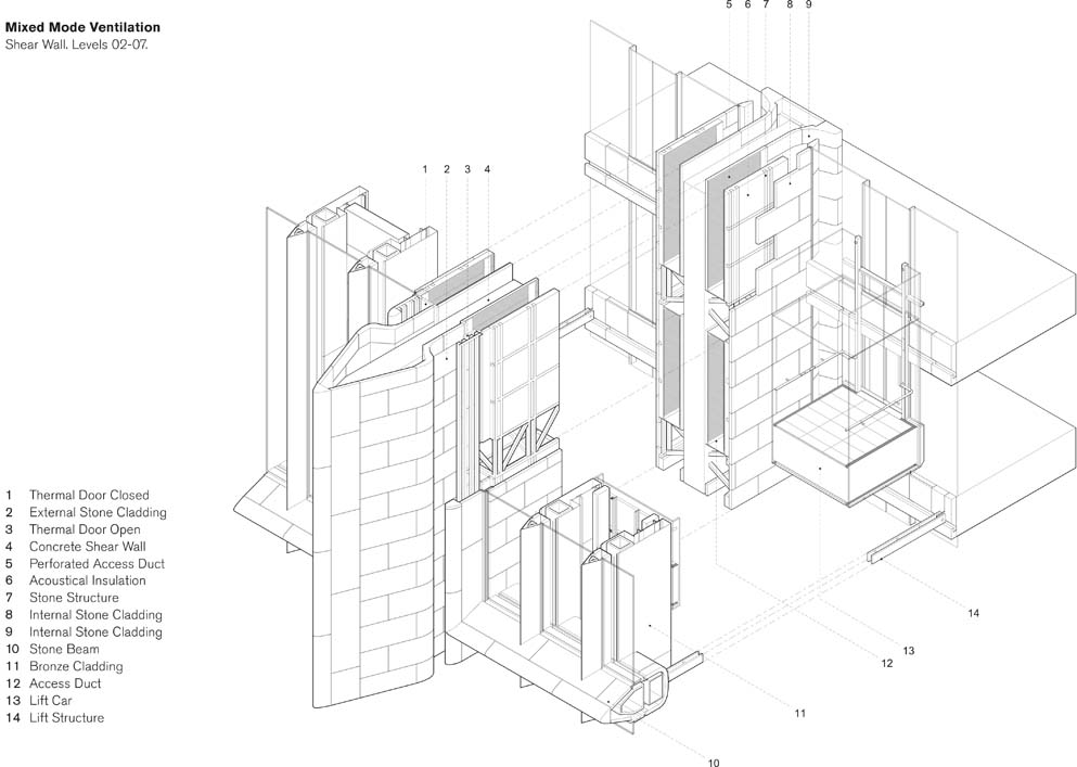Un marco estructural de piedra arenisca de Derbyshire divide sus fachadas en áreas rectangulares ocupadas por vidrio y aletas de cobre como medio de protección solar.