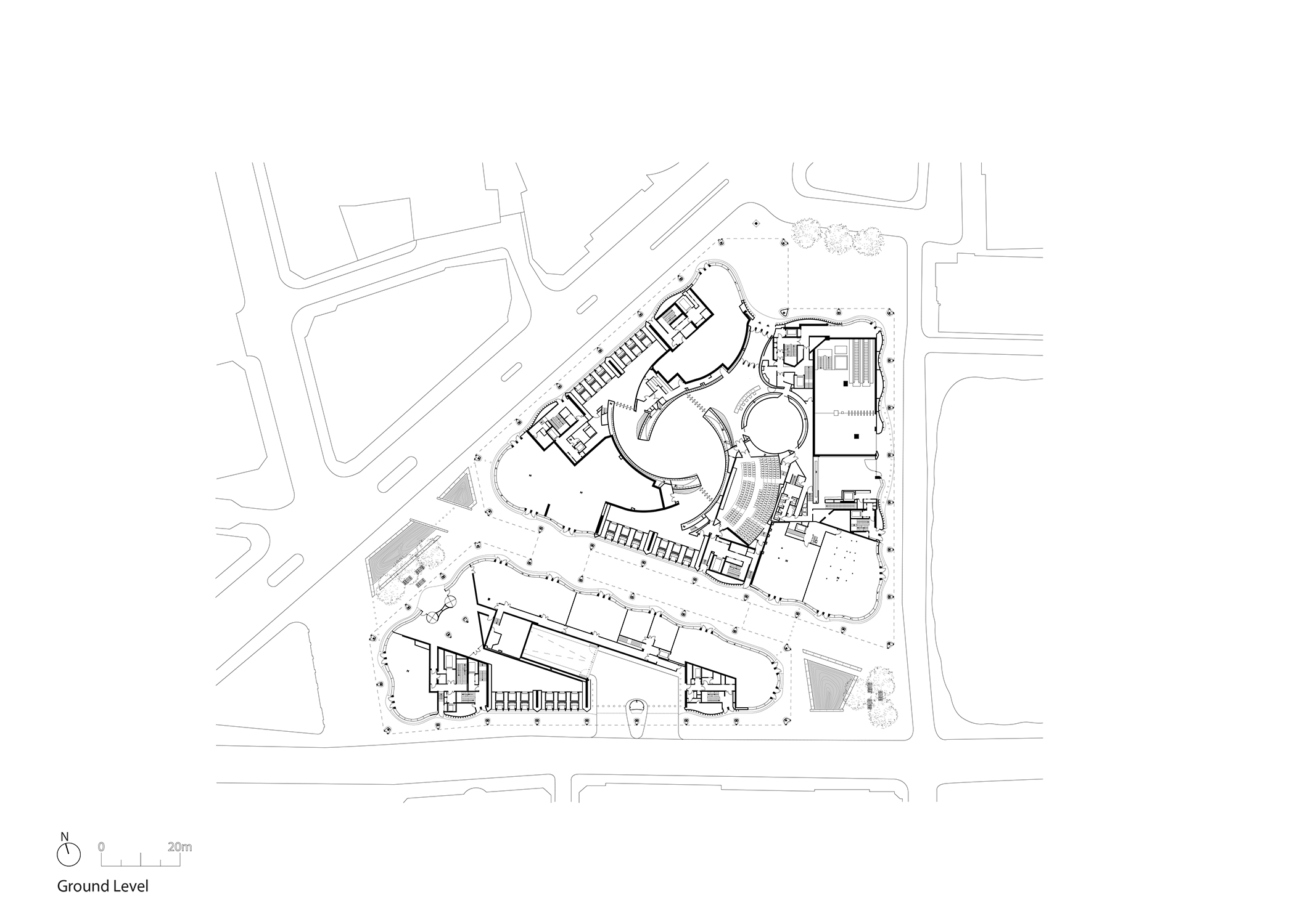 Volviendo a temas espaciales, la forma en que se invita a recorrer el edificio resulta igualmente interesante. La planta baja rompe su ortogonalidad con una fachada ondulada retranqueada. El peatón disfruta de ese modo de un espacio peatonal ampliado, al abrigo de la estructura porticada de arenisca.