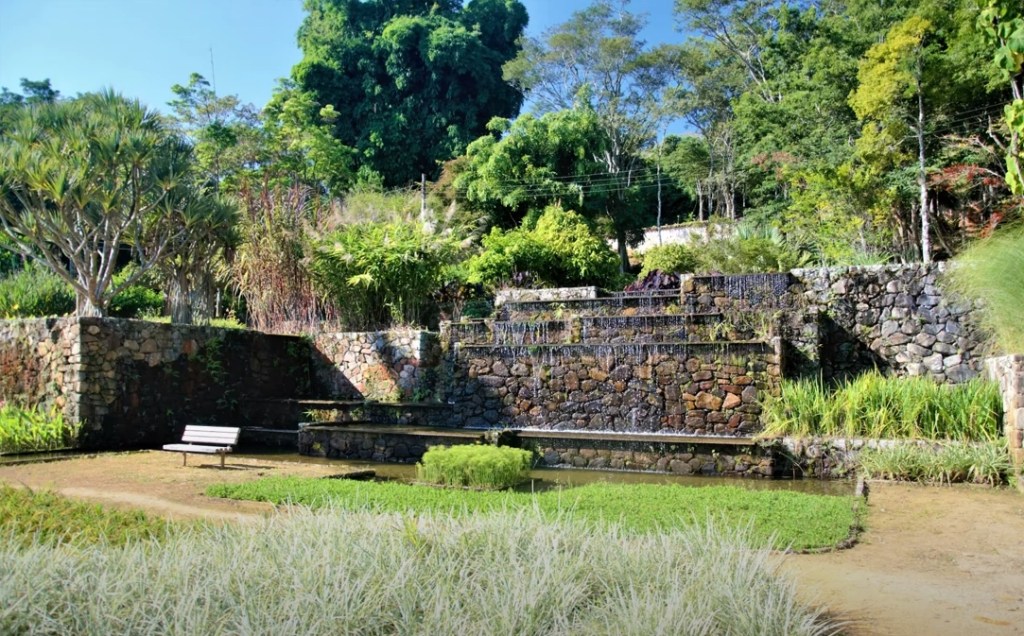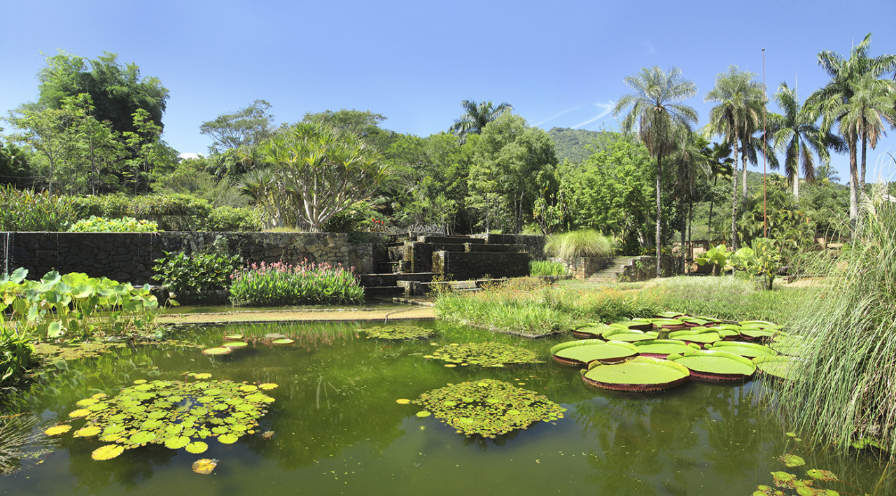 Fiel a su estilo, Burle Marx persiguió la belleza y exuberancia mezclando especies autóctonas con otras no nativas. Arecáceas, ágaves, aloes, bromelias, e incluso grandes nenúfares en amplios estanques conviven en exótica armonía. El agua no podía faltar, pero en un jardín como éste, su papel compositivo cobra especial relevancia al convertirse en el nexo de unión entre las plataformas con un total de 19 cascadas.