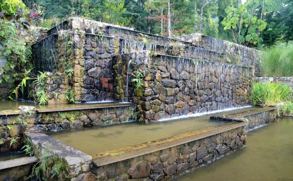 El gran estanque del nivel superior cae en uno de sus lados en forma de una única cascada, mientras que del otro, su perímetro se disgrega en múltiples saltos escalonados. Disfrutar de las vistas en ese banco de madera, con los nenúfares a tus pies y el sonido de las cascadas tras de ti debe ser terapéutico! El agua prosigue su descenso hasta el nivel inferior, donde una gran playa de madera acota el final de su recorrido en forma de dos piscinas naturales.