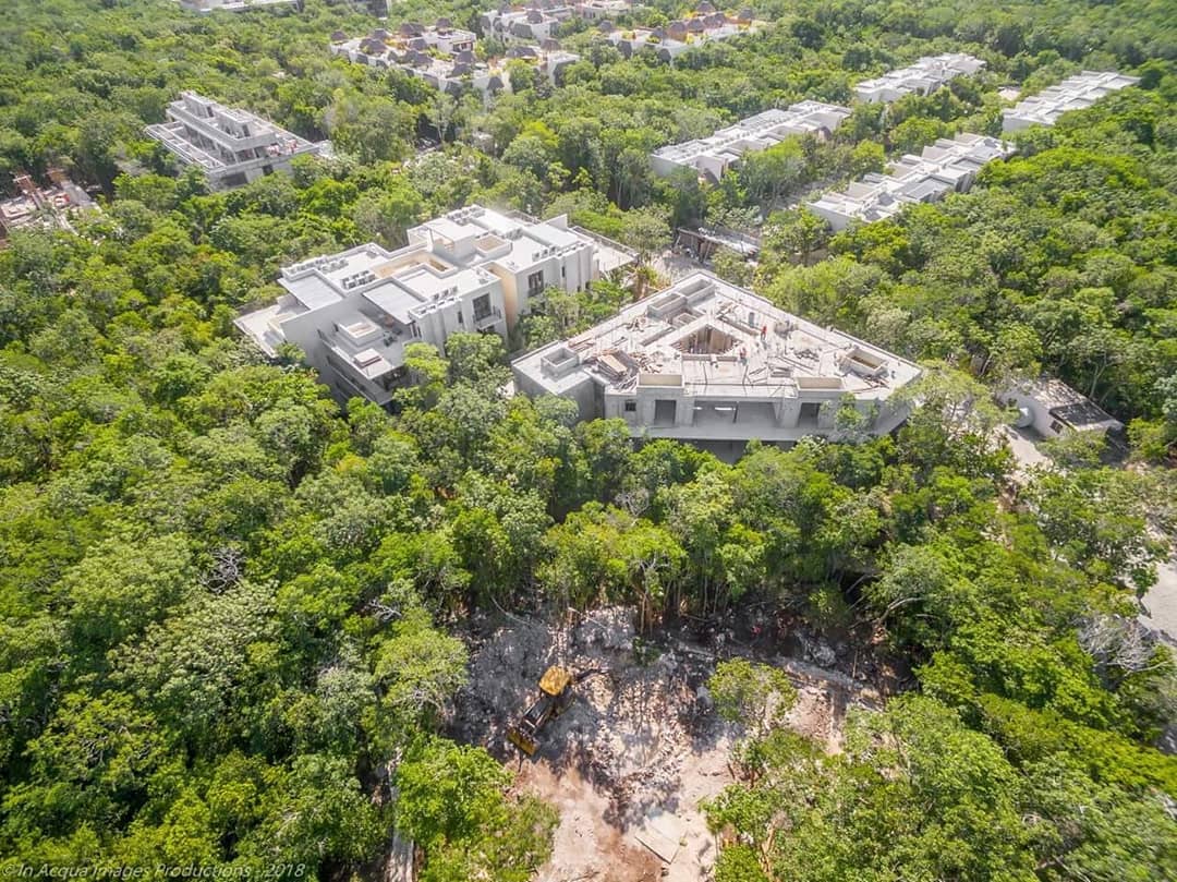 Igual de interesante resulta comparar el master plan inicial de Luum Zama con sucesivas fotos aéreas, en las que unas construcciones de hormigón, de ocupación aparentemente superior a la considerada de origen, van ganando terreno a una vegetación menguante. Supongo que solo queda cruzar los dedos para que el compromiso de un 50% del terreno destinado a la selva natural no se convierta en la sombra de una promesa incumplida.