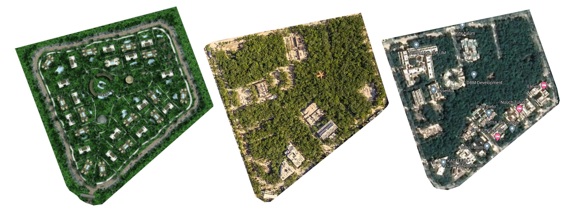 Junto a Luum Zama se extienden otras urbanizaciones como la Aldea Premium y la Aldea Zama, ésta última de considerable extensión. Por ahora, a vista de pájaro se perfilan con amplias calles que fragmentan la selva en parcelas de naturaleza, a la espera de ser ocupadas por promociones residenciales, comerciales o turísticas. Un ejemplo sería el proyecto en fase de diseño del hotel y resort Cocoon, del estudio DNA Barcelona Architects.