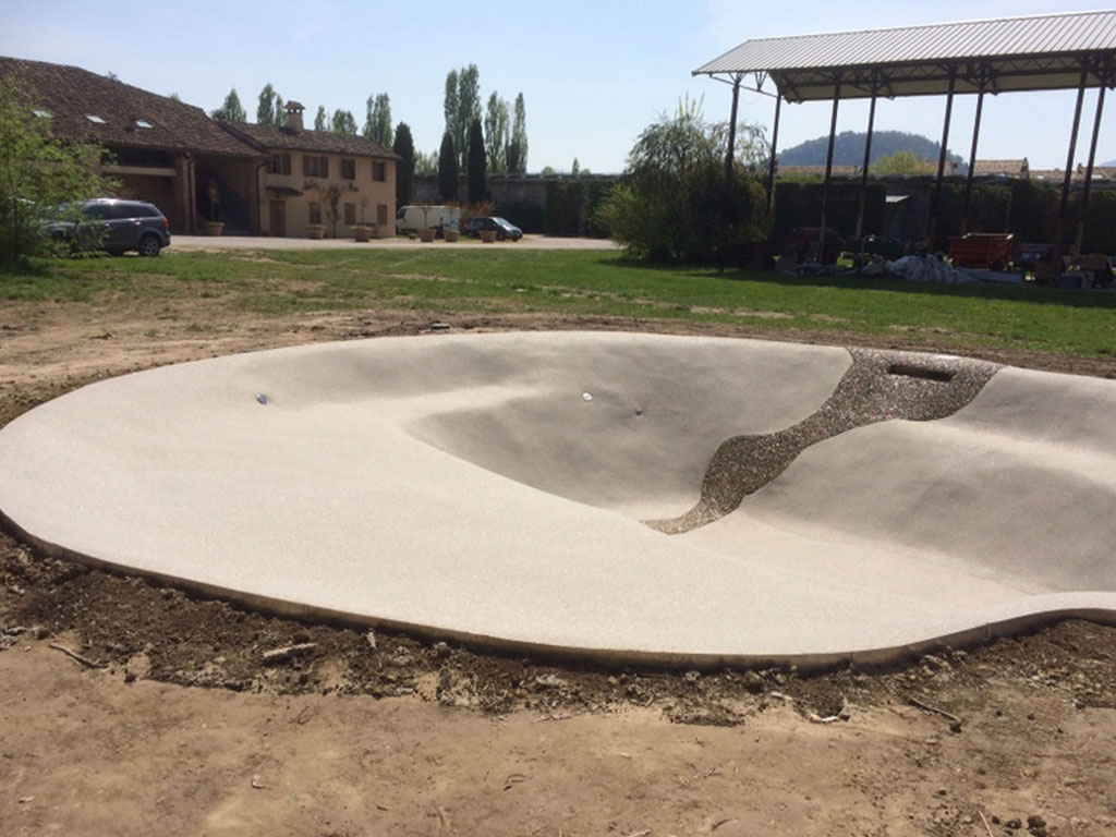 - Capa estructural rígida y permeable de arenas y piedra natural de varios tamaños y resina de Biodesign, con malla de fibra superior e inferior. Su peso es de 70kg/m2, y ofrece una resistencia de 2.000 kg/m2.
