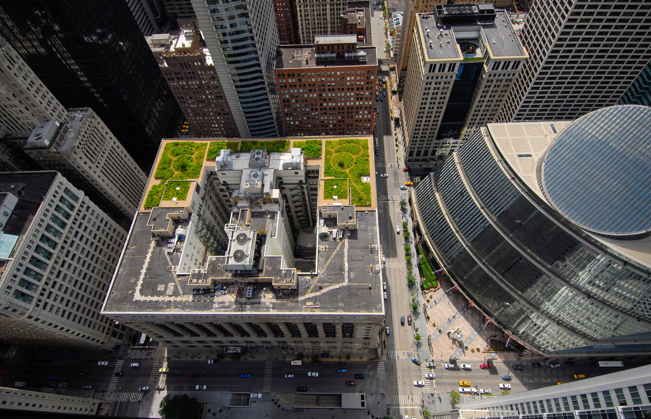 La cubierta verde del Ayuntamiento de Chicago es un buen ejemplo de intervención en un edificio histórico. La obra es del año 2001, y ocupa la mitad de la azotea, de 23.000m2 de superficie. La parte vegetada se ha diseñado como un jardín transitable, que reúne a más de 20.000 plantas de 150 especies diferentes, incluyendo arbustos y árboles de bajo porte. Como curiosidad, el jardín da cobijo a varias colmenas de abejas que polinizan las flores.