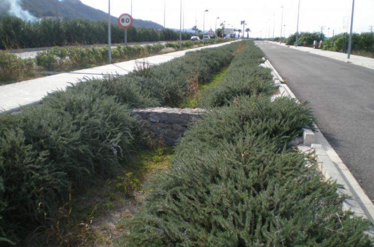 A simple vista, la vegetación que cubre estas cunetas podría hacernos pensar en un jardín de lluvia. Compartiendo muchas semejanzas con los sistemas anteriores, las características que diferencian las cunetas vegetadas es que se tratan de amplios canales de poca profundidad y con una pendiente tendida. Su diseño está pensado para captar y ralentizar la escorrentía, permitiendo su filtrado y la eliminación de contaminantes. En ocasiones, incluye muretes transversales de contención del agua, para evitar la erosión de la capa vegetada.