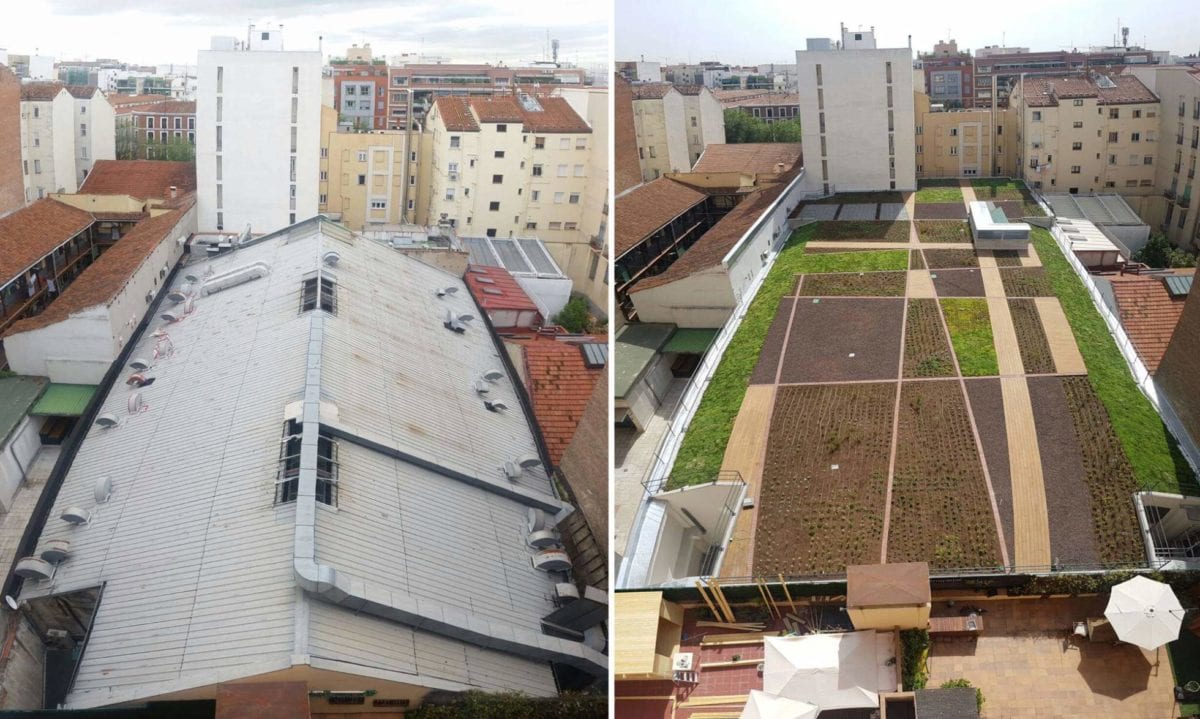 En España contamos con ejemplos como la marca Mercadona que ha apostado por la rehabilitación de tres de sus supermercados urbanos en Madrid con cubiertas vegetales. Al tratarse de cubiertas en el interior de manzanas de viviendas, en el marco de la Ordenanza de la calidad del Aire de Madrid suponen una inversión que apuesta por la mejora de las condiciones del entorno urbano. Una cubierta de este tipo supone una mejora de la calidad del aire y una mayor capacidad de regular su temperatura, mitigando de ese modo los efectos de las islas de calor urbano.