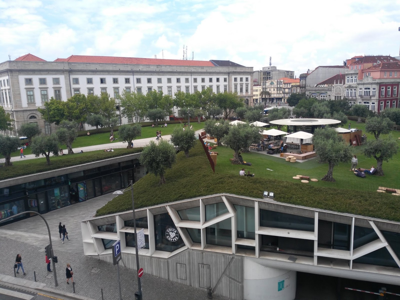 La plaza de Lisboa en Oporto es una cubierta vegetal con carácter urbano. Su reforma es del año 2013, bajo la dirección del estudio de arquitectura Balonas&Menano. Incluye una calle peatonal que atraviesa el edificio, y convierte su cubierta en un jardín transitable con 50 olivos.