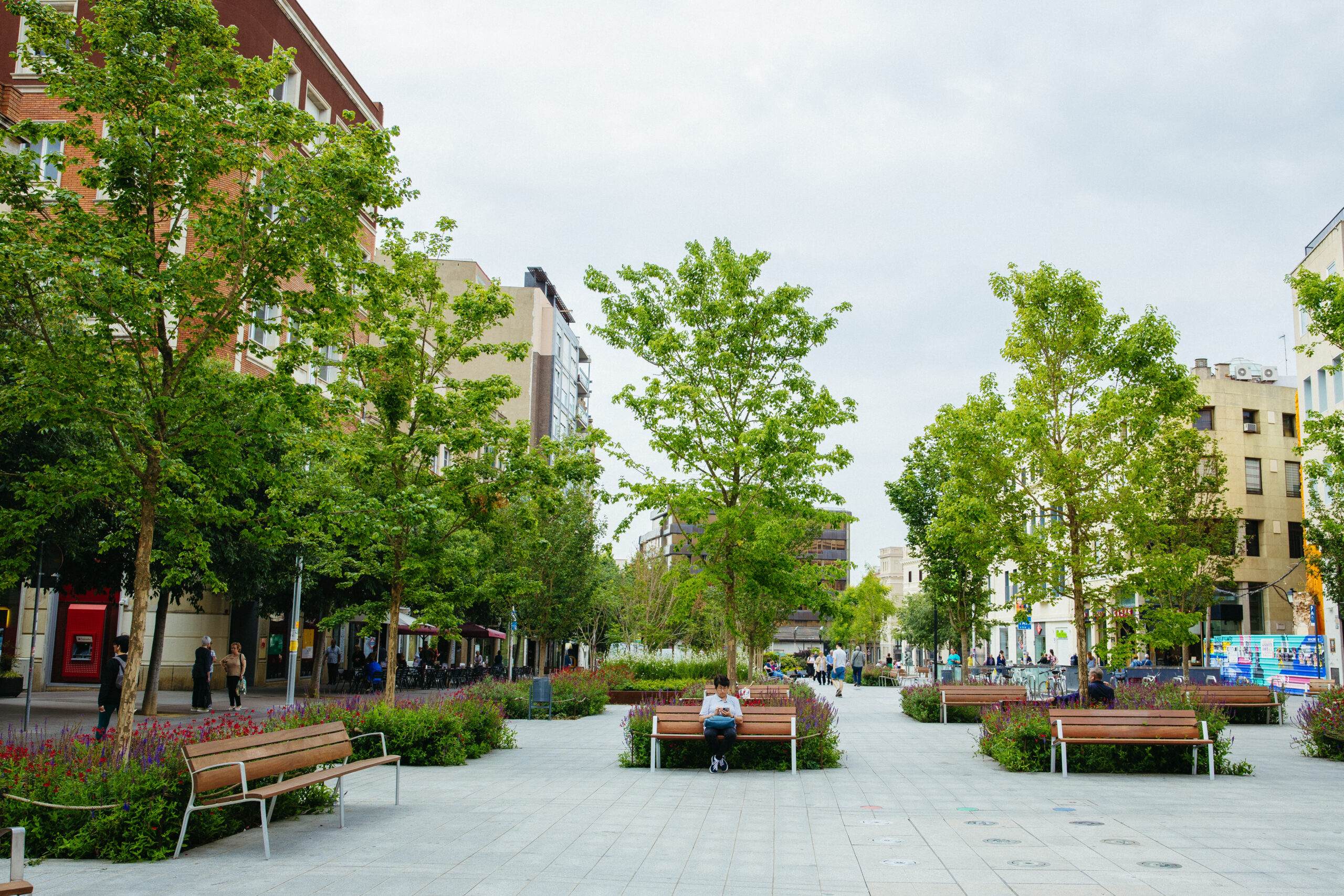 Aquí tenemos dos grandes ejemplos de intervención urbana con pavimentos permeables. Ambas propuestas, del estudio de arquitectura y paisajismo de Lola Domenech, apuestan por un urbanismo más saludable y pensado para el peatón.