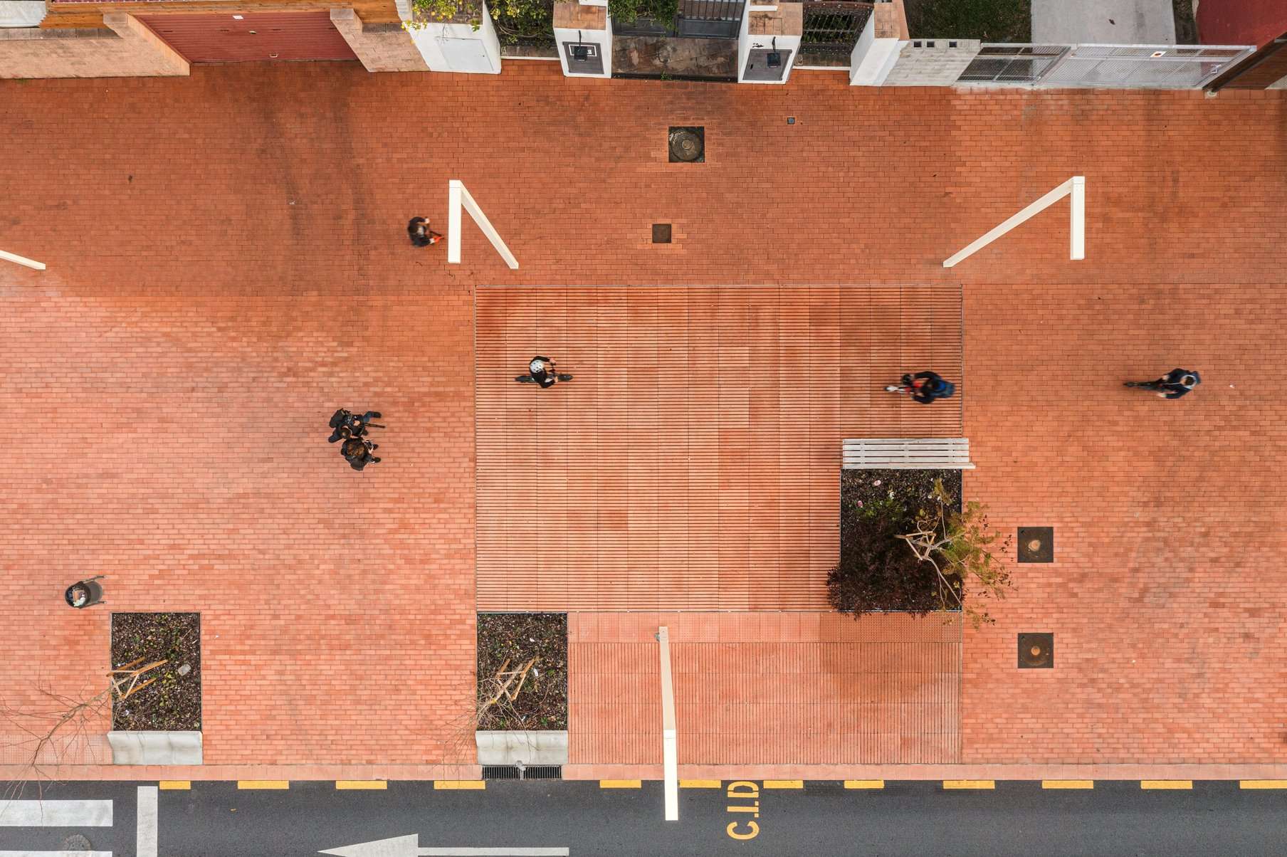 El recorrido se ve salpicado de alcorques y zonas de asiento, permitiendo el crecimiento de una vegetación que se fusiona con el despiece del pavimento, superándose el 60% de superficie total de acera drenante.