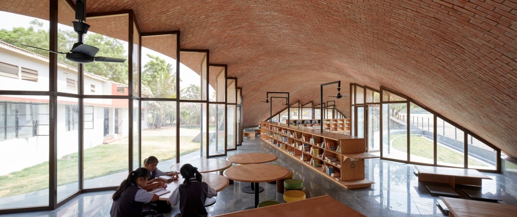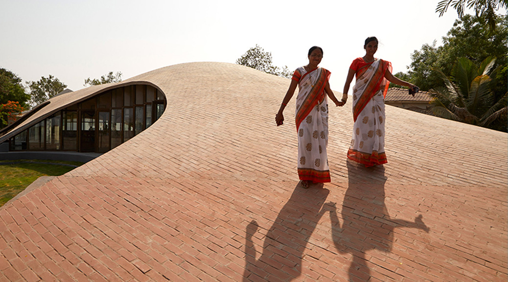 El confort bajo el sol abrasador en este pueblo de la India fue un factor decisivo para la elección del ladrillo en esta biblioteca, en una especie de fusión de las bóvedas a la catalana de Guastavino y las conchas de hormigón de Eladio Dieste…