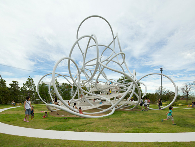 Con este parque infantil en Hamakita (Japón – 2014), los arquitectos de Suppose Design Office proponen una arquitectura que pueda crecer y expandirse en cualquier dirección tal y como lo haría un bosque. A base de tubos metálicos consiguen una estructura sin fin que se entrelaza apoyándose en sí misma. Varias redes cuelgan de las barras transformándolo en un juego infantil, pero según sus autores bien podría albergar habitáculos como casas en los árboles.